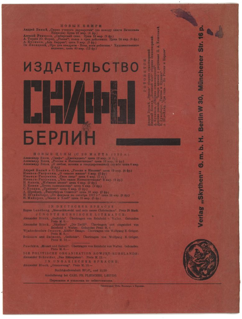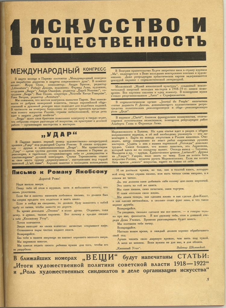 Вещь. (Objet / Gegenstand): Международное обозрение современного искусства / под ред. Эль Лисицкого и Ильи Эренбурга. № 1-2. Берлин: Издательство «Скифы» (Skythen); Тип. Отто Эльснера, 1922. 32 с., ил. 30,3×23,3 см. В издательской конструктивистской обложке работы Эль Лисицкого. Реставрация. Блок чистый.